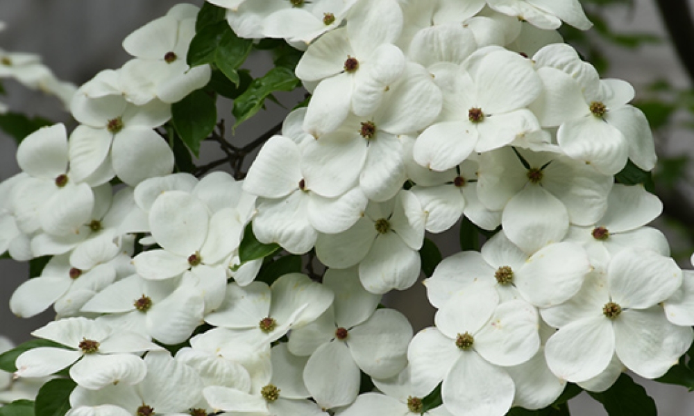 Beautiful, white star-like bracts cover this small broadly spreading ornamental tree with layered branches; bracts are rounded compared to the species, starts flowering a few days after other varieties have stopped; produces no fruit.