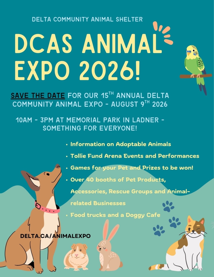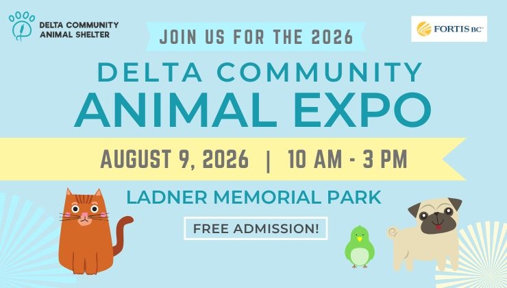 The Delta Community Animal Shelter, alongside FortisBC, proudly presents the Delta Community Animal Expo at Ladner Memorial Park on Sunday, August 9, 2026 from 10 am to 3 pm.