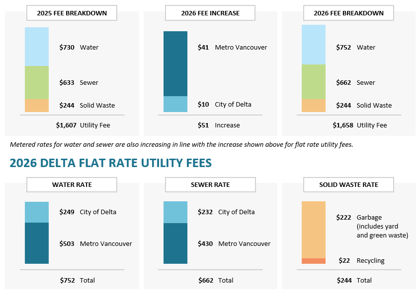 Delta’s 2026 utility rates reflect rising regional costs, including Metro Vancouver’s water and sewer operations and infrastructure upgrades.